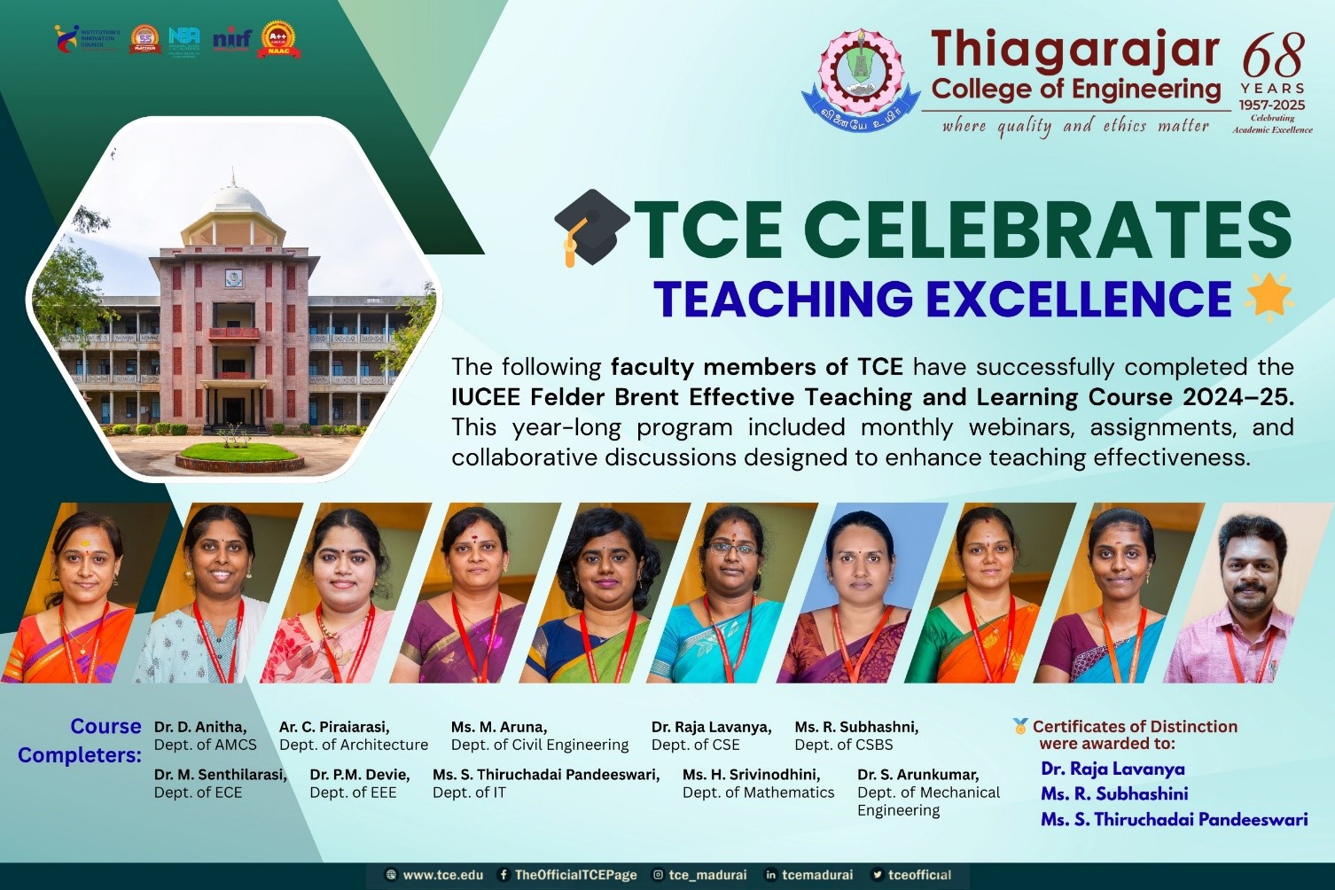 TCE has been collaborating with IUCEE and launching various events since 2016. The Academic Process team of TCE has been actively participating in almost all the programs launched by IUCEE. Any programs initiated by IUCEE are appreciated by TCE Academic Process and appropriate nominations are made to attend the programs. We present a quick travel here under the given sub sections.
