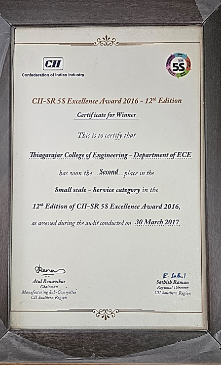 CII – SR 5S Excellence Award 2016 – 12th Edition Department of ECE has won SECOND place in small scale – service category