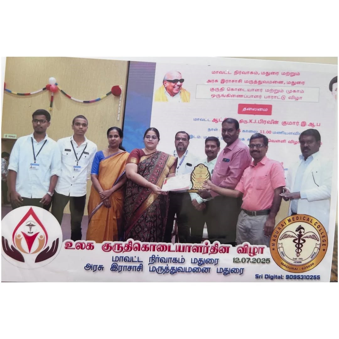 TCE secured 3rd Prize for organizing the most blood donation camps, awarded by Rajaji Government Hospital, Madurai. |