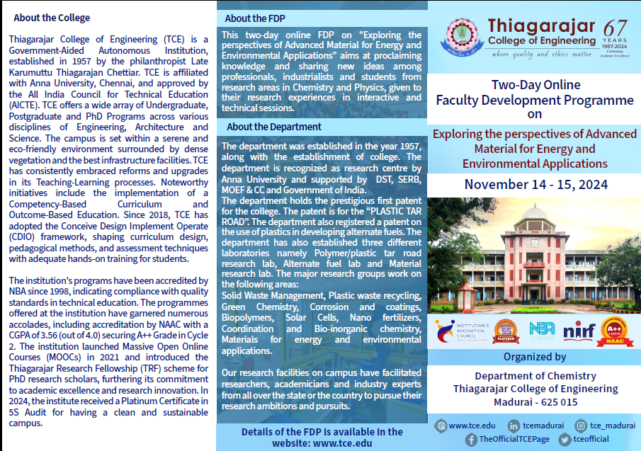 FDP on “Exploring the perspectives of Advanced Material for Energy and Environmental Applications.” during 14.11.24 & 15.11.24 by the Department of Chemistry. 72 participants from different higher learning institutes participated in the program