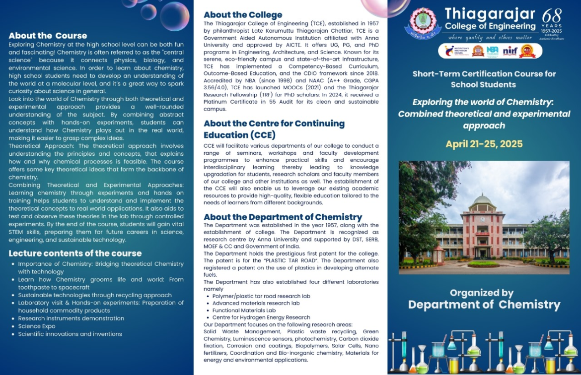 Short-Term Certificate courses for school students “ Exploring the world of Chemistry: Combined theoretical and experimental approach” during April 21-25, 2005 by Dept of Chemistry.