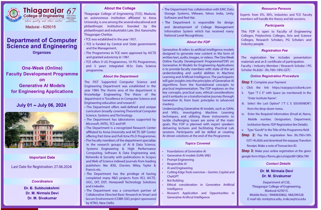 1 | Faculty Development Programme 1.One week Online FDP on Next-Gen Computing Paradigms for Bigdata Applications 2.One week Online FDP on Generative AI Models for Engineering Applications | 2 |