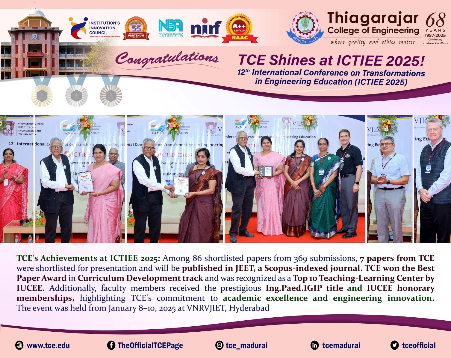 TCE has been collaborating with IUCEE and launching various events since 2016. The Academic Process team of TCE has been actively participating in almost all the programs launched by IUCEE. Any programs initiated by IUCEE are appreciated by TCE Academic Process and appropriate nominations are made to attend the programs. We present a quick travel here under the given sub sections.